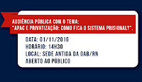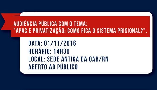 Com o objetivo de mobilizar as instituições e a sociedade civil para discutir os rumos do sistema penitenciário potiguar, a Ordem dos Advogados do Brasil no RN, por meio da Comissão de Advogados Criminalistas que é presidida por Gabriel Bulhões, realizará no dia 1º de novembro, próxima terça-feira, às 14h30, na sede da Seccional Potiguar, na capital do estado, Audiência Pública para discutir o tema “APAC e privatização: como fica o sistema prisional?”.
